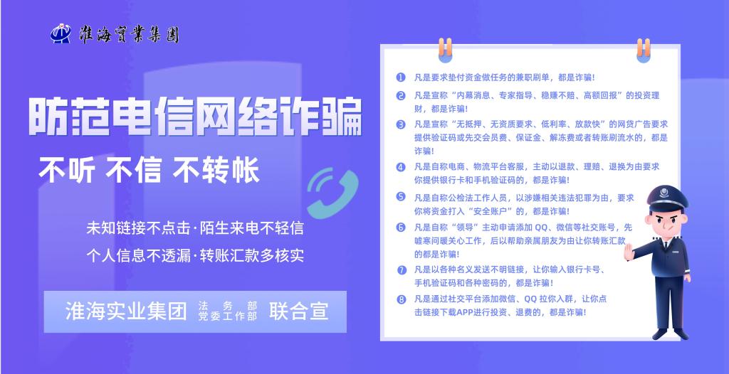 為切實維護職工群眾財產安全,提升電信網絡詐騙識別防范能力,連日來,淮海實業集團開展電信防詐騙宣傳活動?;顒油ㄟ^制作展板、宣傳海報、觀看宣傳片等方式,列舉近年來電信詐騙案例,介紹電信網絡詐騙的手段、特點和形式,讓職工群眾深刻了解電信網絡詐騙的危害,以及識別和防范措施。同時提醒公司職工要時刻保持頭腦清醒,增強安全防范意識,用實際行動維護自身合法權益。(劉強