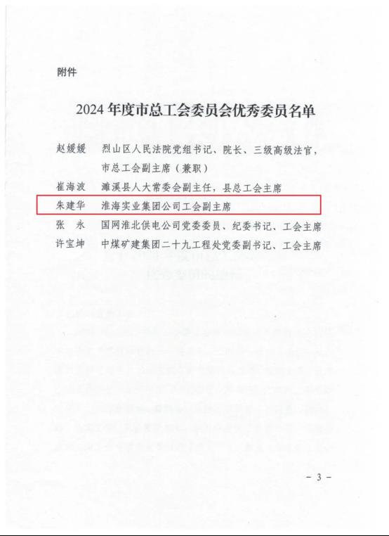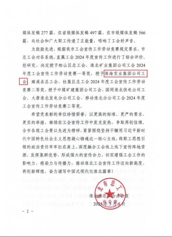 3月6日,淮北市總工會召開十三屆三次全委(擴大)會議。會上通報了2024年度全市“五型工會”勞動競賽優勝單位、宣傳工作勞動競賽結果和市總工會委員會優秀委員。淮海實業集團工會獲2024年度“五型工會”勞動競賽二等獎、全市工會宣傳工作勞動競賽二等獎,集團工會副主席朱建華獲評市總工會委員會優秀委員,并在會上做交流發言。