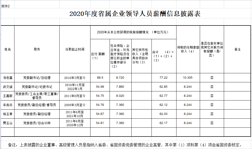 2020年度省屬企業領導人員薪酬信息披露
