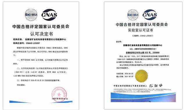 6月7日,安徽礦機(jī)檢測(cè)中心取得“中國(guó)合格評(píng)定國(guó)家認(rèn)可委員會(huì)”(CNAS)實(shí)驗(yàn)室認(rèn)可資質(zhì),其檢測(cè)能力、測(cè)試結(jié)果可直接用于產(chǎn)品性能國(guó)際互認(rèn),標(biāo)志企業(yè)檢測(cè)中心公信力邁上新臺(tái)階。