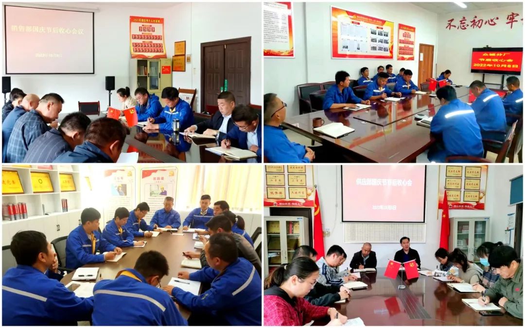 國慶假期結(jié)束,集團(tuán)公司采取召開晨會(huì)、專題會(huì)議、舉行升旗儀式等形式,教育引導(dǎo)廣大干部職工迅速收心歸位,脫離休假狀態(tài),進(jìn)入工作角色,擺脫“節(jié)后綜合征”,以最佳的精神狀態(tài)、飽滿的工作熱情迅速投入到?jīng)Q戰(zhàn)四季度、奮戰(zhàn)全年目標(biāo)的工作當(dāng)中。