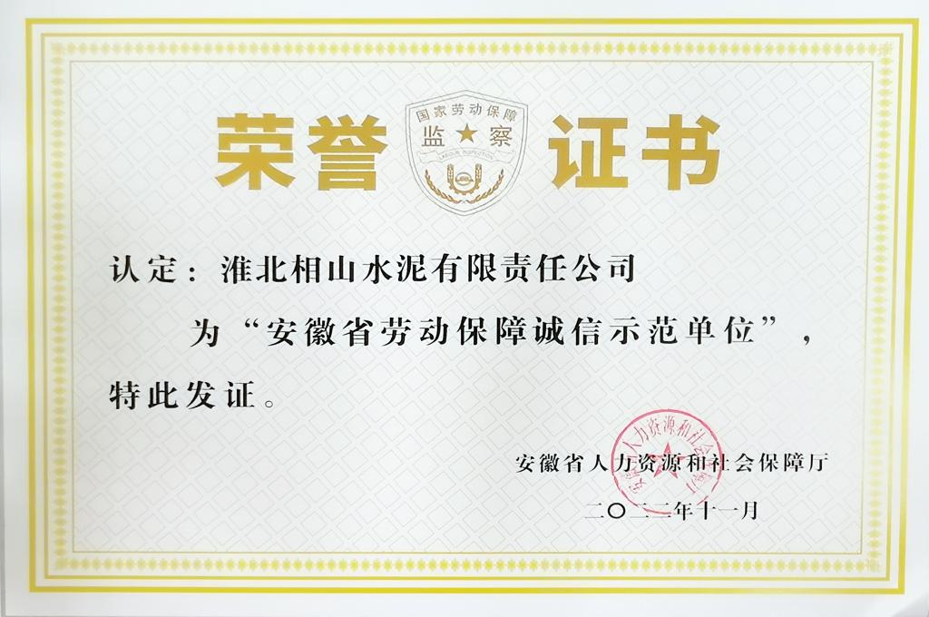 日前,省人力資源和社會(huì)保障廳公布2022年安徽省勞動(dòng)保障誠信示范單位評(píng)選結(jié)果,相山水泥公司成功入選。