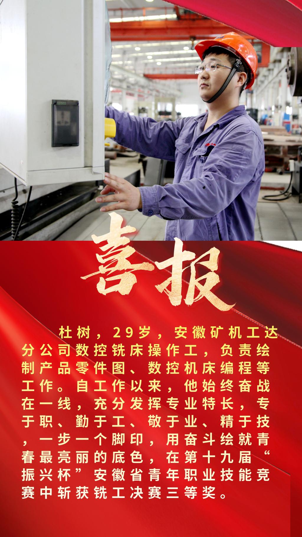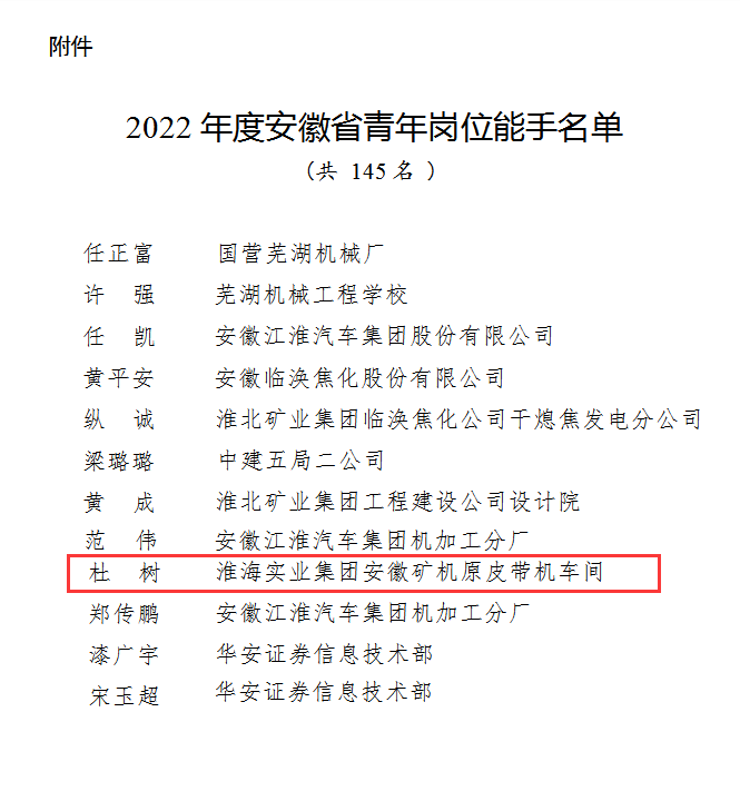 近日,團省委聯合省人力資源和社會保障廳開展2022年度“安徽省青年崗位能手”命名活動,對2022年以來在各類職業技能大賽中脫穎而出的145名青年授予“安徽省青年崗位能手”稱號。其中,淮海實業集團杜樹光榮上榜。