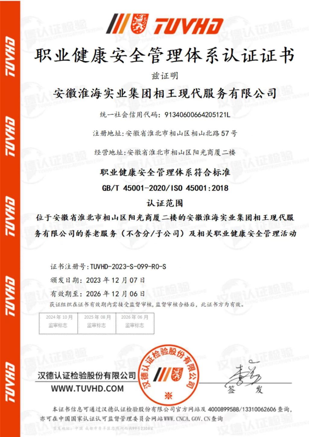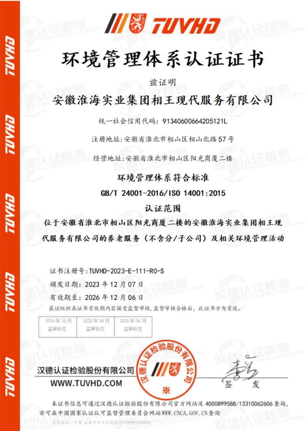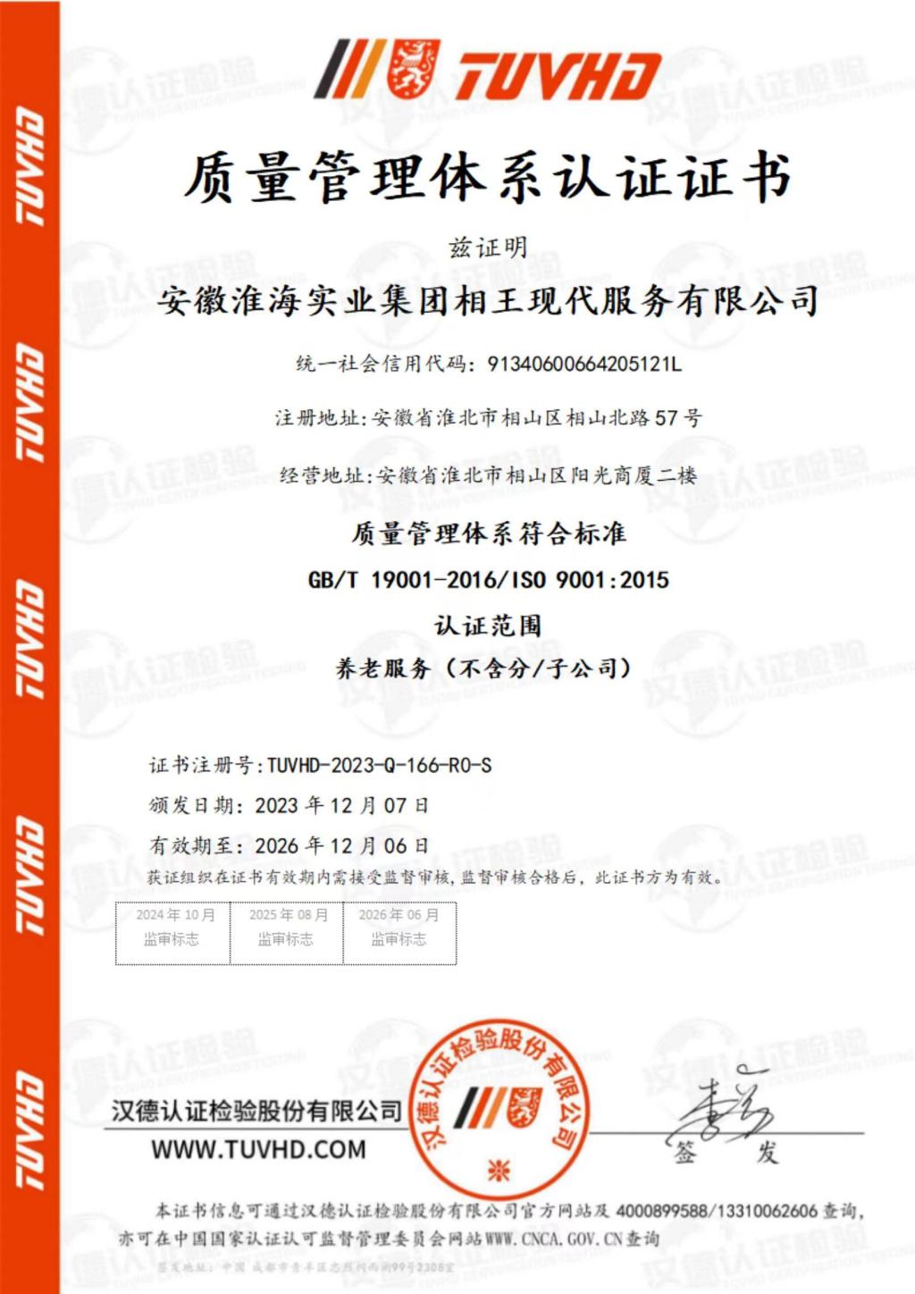 CNCA認證專家組,深入相王現代養老產業服務現場,圍繞淮海康養中心設備設施、管理運營,以及場所環境、衛生、客戶滿意度等方面,開展全面評估,經過嚴格審核,一致認為管理體系完善,符合認證要求,予以審核通過。