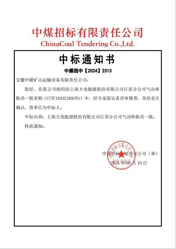 近日,安徽礦機中捷公司中標上海大屯能源股份有限公司江蘇分公司氣動單軌吊項目,標志著企業“拳頭產品”實現江蘇銷售市場“零”的突破,進一步擴大了產品覆蓋區域。
