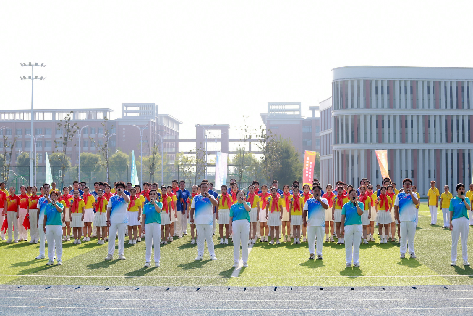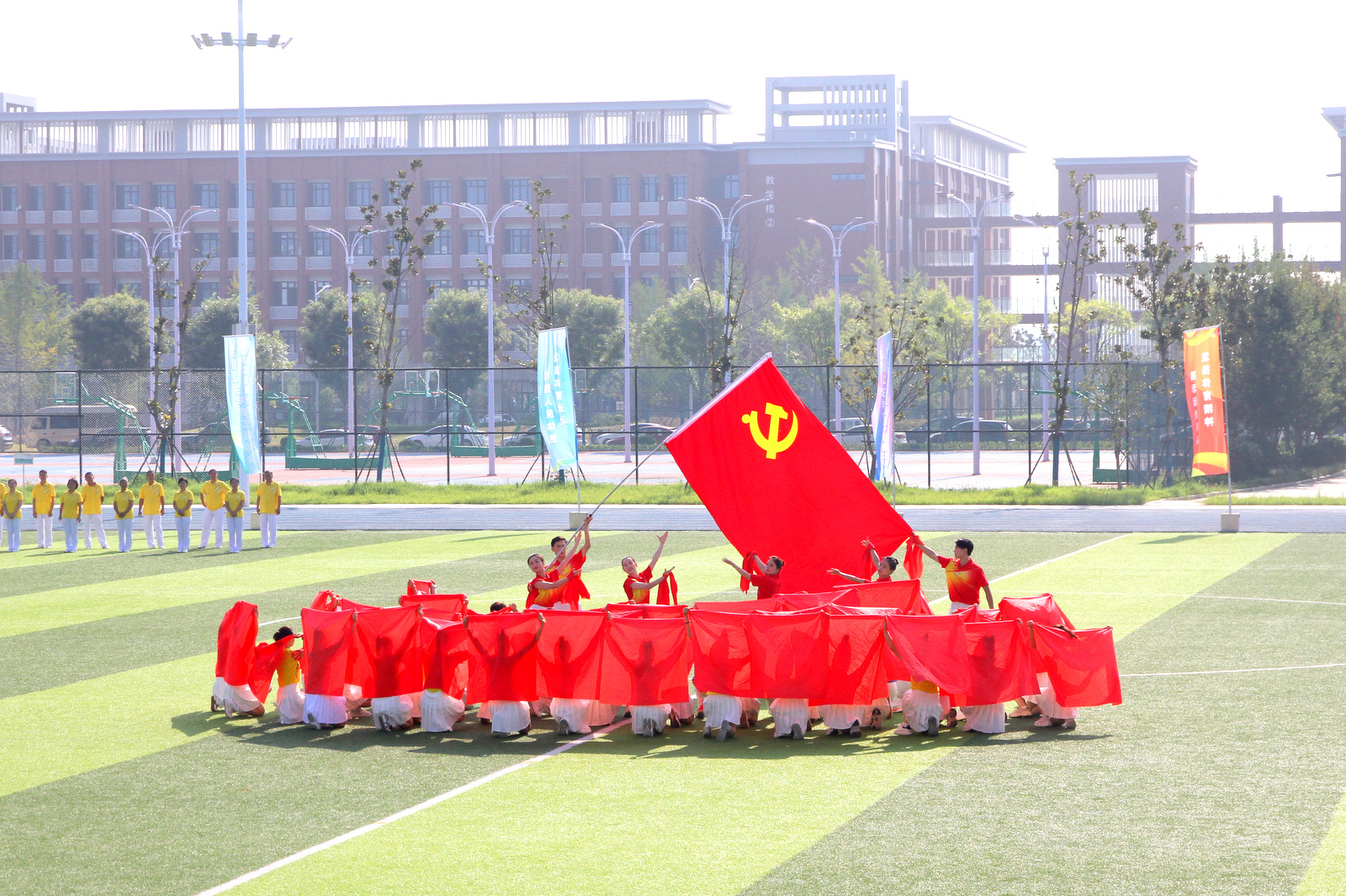 開幕式上,還舉行了文體表演。《飛的更高》表達(dá)了站在新起點(diǎn)、邁向新征程的淮海人奮力推進(jìn)高質(zhì)量發(fā)展再上新臺(tái)階的永恒追求;“八段錦”健身功法表演緩慢柔和圓活連貫、松緊結(jié)合動(dòng)靜相兼,展示了中華傳統(tǒng)文化的獨(dú)特魅力;集體舞《心中的旗》展現(xiàn)了永遠(yuǎn)聽黨話、感黨恩、跟黨走的不變信念和抓黨建、促發(fā)展、筑和諧的發(fā)展理念。在全場(chǎng)高唱《歌唱祖國》的歌聲中,運(yùn)動(dòng)會(huì)開幕式圓滿結(jié)束。