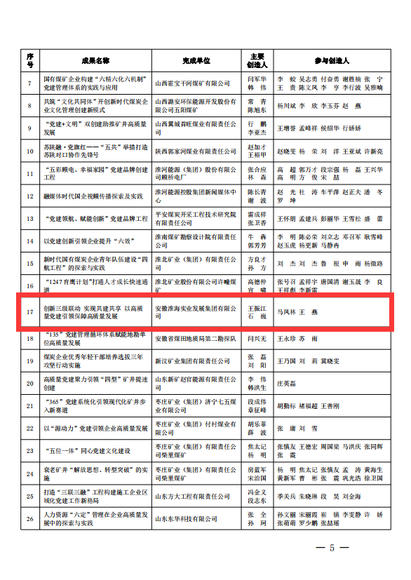 開展管理創新是集團公司深化企業內部管理的重要舉措,也是總結和推廣集團先進的管理思想、管理模式、管理制度、管理機制和方法的重要手段。據統計,截至目前,集團公司在“黨建引領、精益管控、數字化提升和技術創新”等方面共形成20余項成果,其中8項成果先后獲得全國煤炭企業管理現代化創新成果獎、國企管理創新成果獎。(高明山)