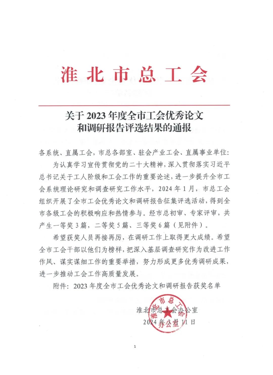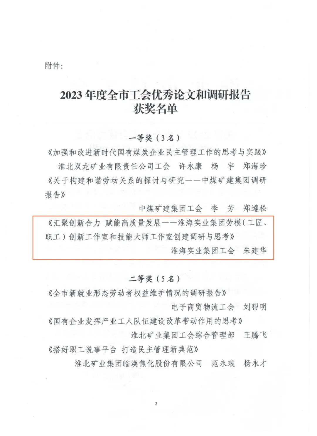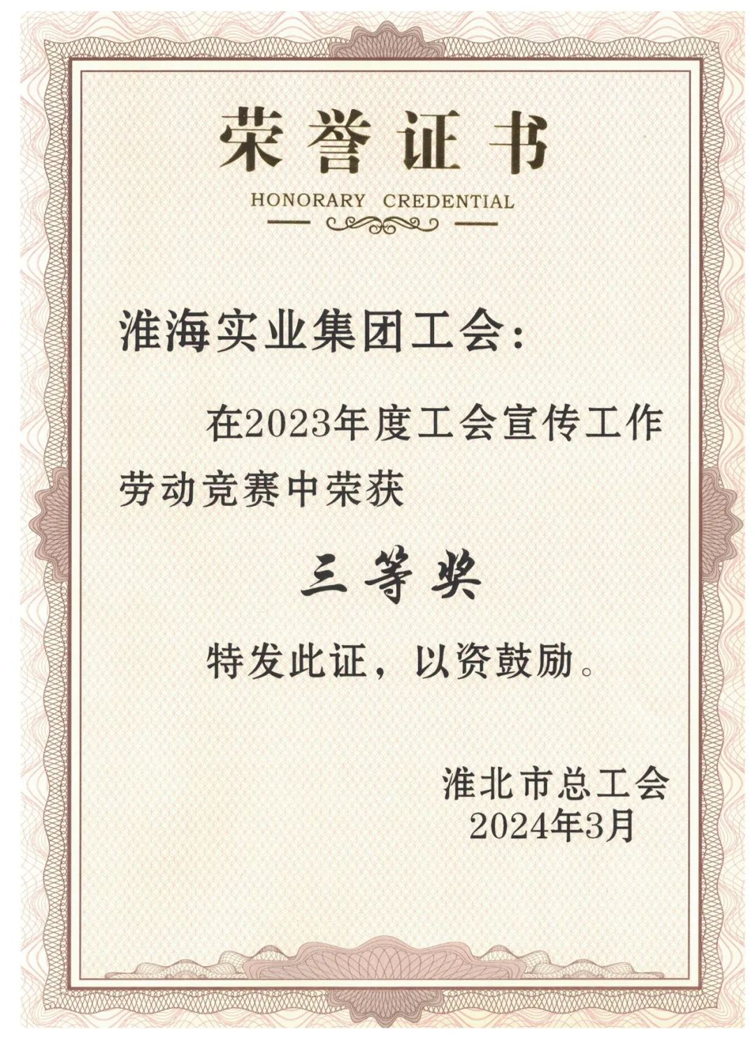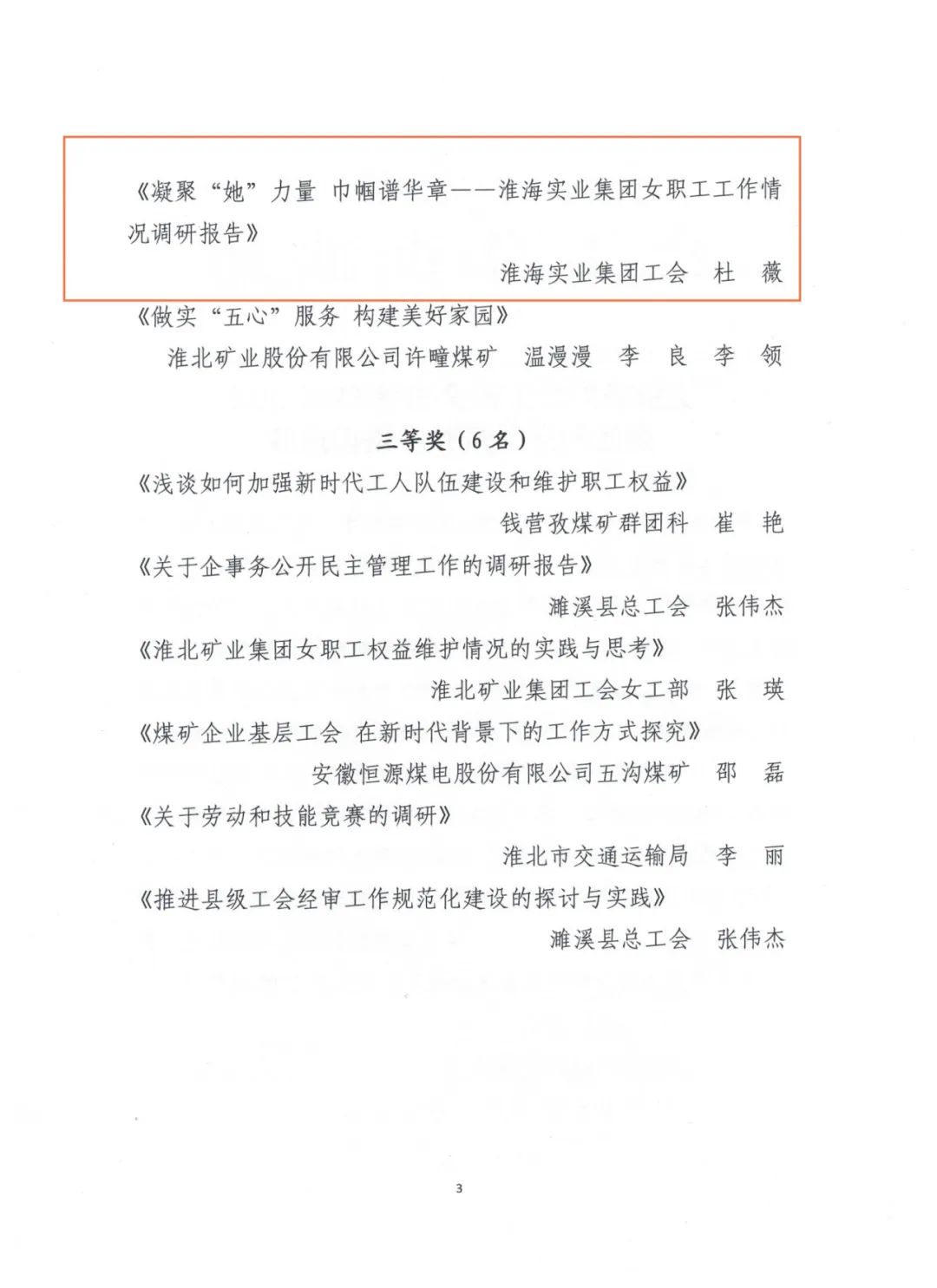 3月12日,筆者了解到,淮海實業(yè)集團工會榮獲淮北市2023年度“五型工會”勞動競賽一等獎、全市工會宣傳工作勞動競賽三等獎。《匯聚創(chuàng)新合力賦能高質(zhì)量發(fā)展--淮海實業(yè)集團勞模(工匠、職工)創(chuàng)新工作室和技能大師工作室創(chuàng)建調(diào)研與思考》《凝聚“她”力量 巾幗譜華章--淮海實業(yè)集團女職工工作情況調(diào)研報告》兩篇調(diào)研報告分獲全市工會優(yōu)秀論文和調(diào)研報告一、二等獎。